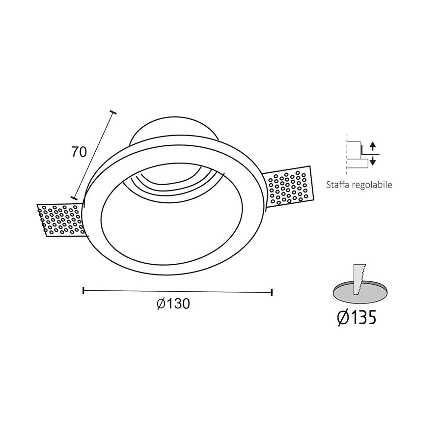 Il faretto da incasso in gesso è una soluzione a scomparsa ideale per soffitti in cartongesso. Con un diametro di Ø130 mm e una profondità di 70 mm, si integra facilmente negli ambienti interni, offrendo un’illuminazione discreta e moderna. La struttura in gesso verniciabile permette la massima personalizzazione, mentre l’attacco GU10 (lampadina esclusa) garantisce compatibilità e semplicità d’uso. Alimentazione 220-240V, potenza supportata fino a 35W, grado di protezione IP20.
