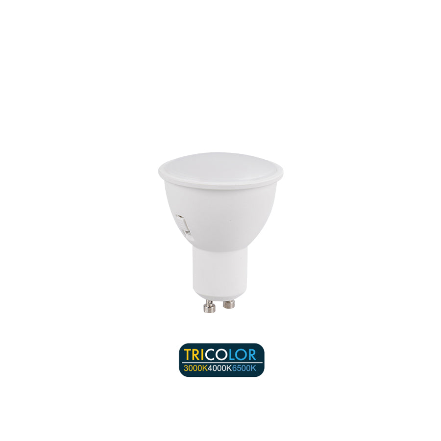 Faretto LED con attacco GU10, potenza 8W e luminosità di 720 lumen, dotato di tecnologia Tricolor: puoi selezionare tra luce calda (3000K), naturale (4000K) o fredda (6500K) tramite l'interruttore integrato.