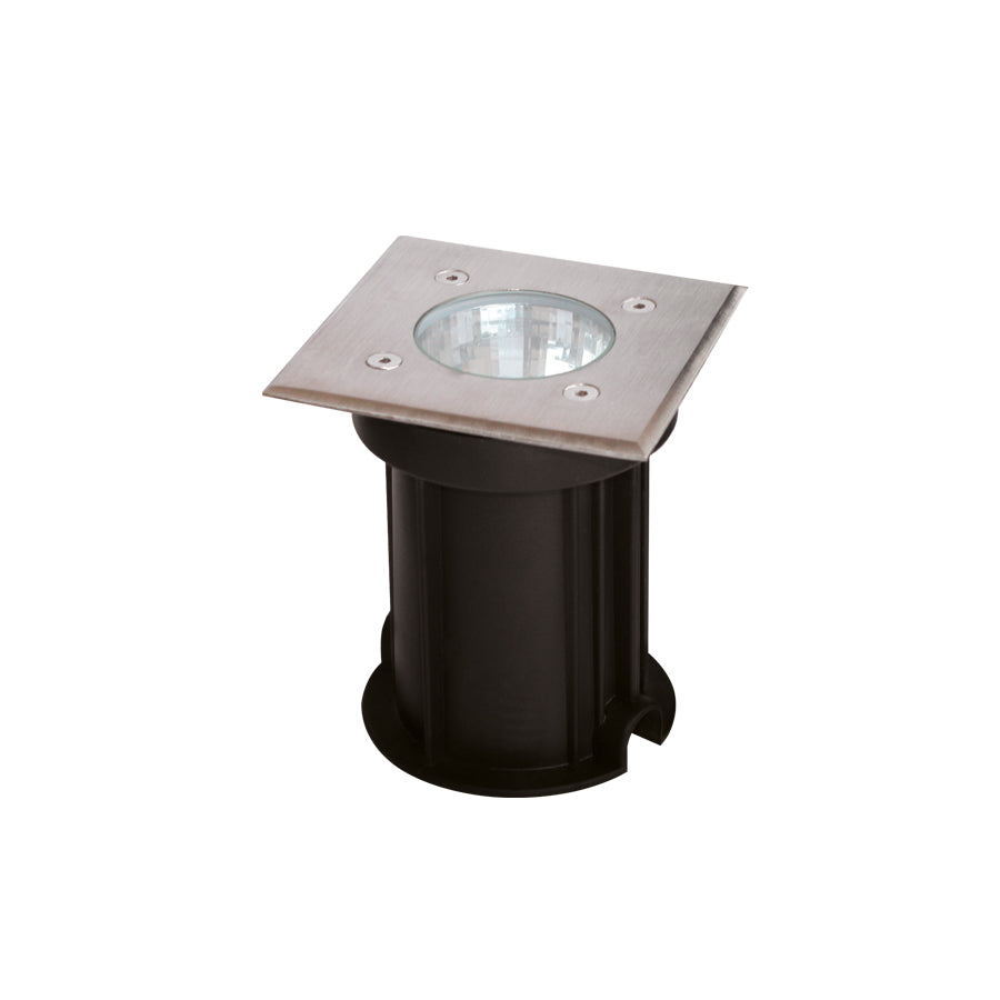 incasso LED a suolo calpestabile IP67, progettato per l'illuminazione da esterno di vialetti, giardini e passaggi pedonali. Dotato di corpo in alluminio pressofuso e cornice in acciaio, è resistente agli urti e agli agenti atmosferici. Completo di portalampada GU10 (lampadina esclusa). Alimentazione 220-240V~, potenza max 50W.
