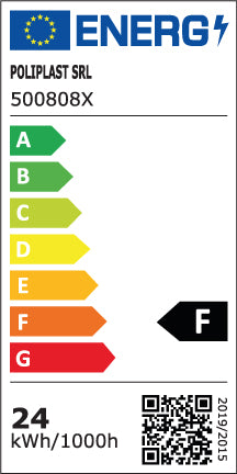 Classe energetica F, consumo di 24 kWh/1000h.
