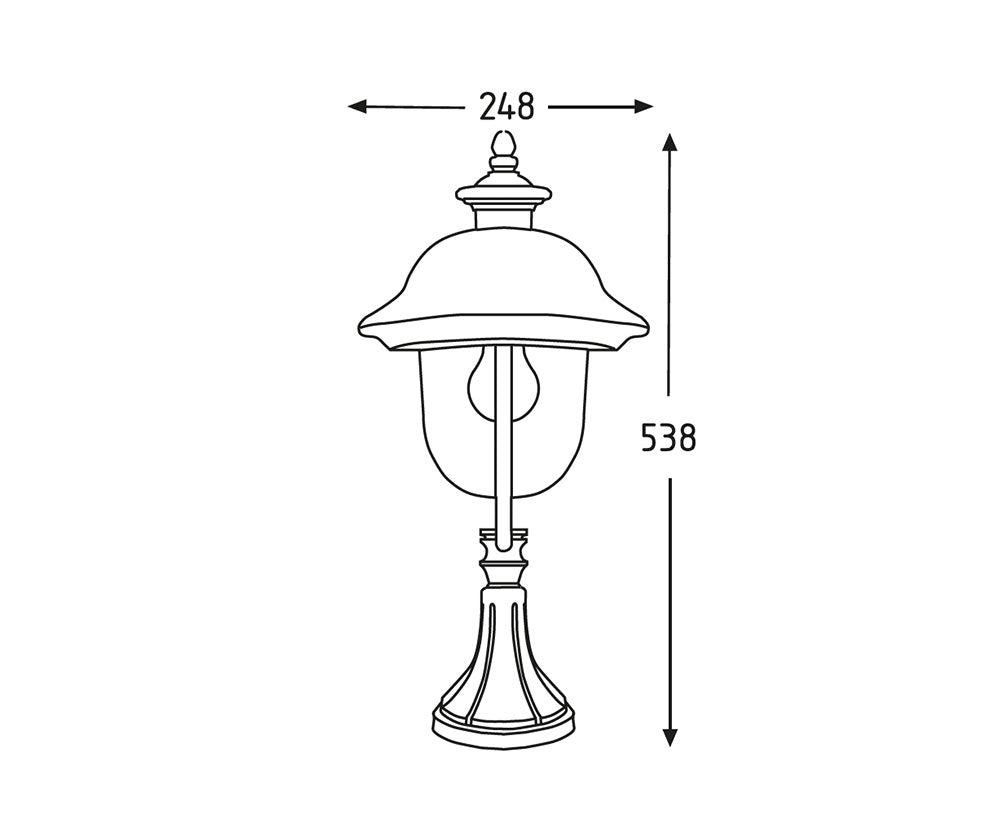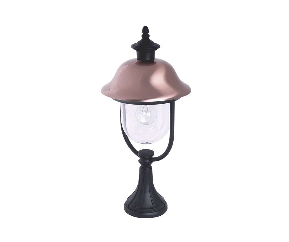 lanterna da esterno elegante con cappello ramato e base di appoggio, ideale per installazioni su colonne, muretti o superfici piane. La struttura in alluminio pressofuso garantisce lunga durata e resistenza agli agenti atmosferici. Il diffusore in policarbonato trasparente assicura una luce brillante e uniforme. Compatibile con attacco E27 fino a 100W. Grado di protezione IP44.